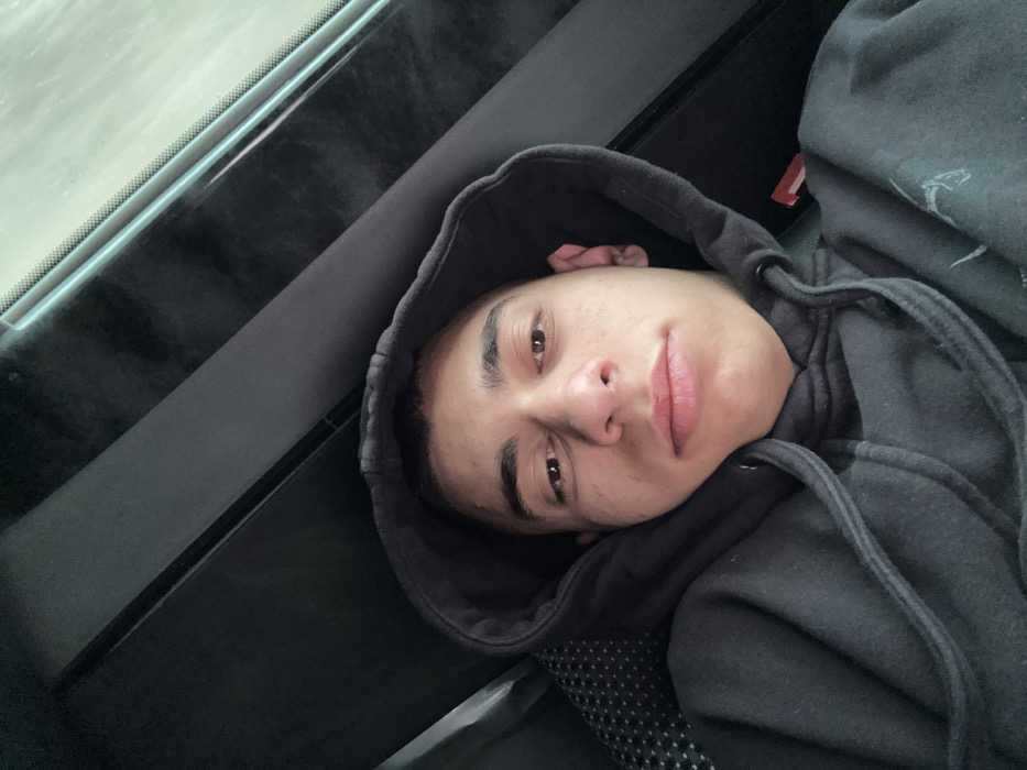 The image displays a close-up, angled view of a young male individual, appearing to be in his late teens or early twenties, seated within the interior of a vehicle