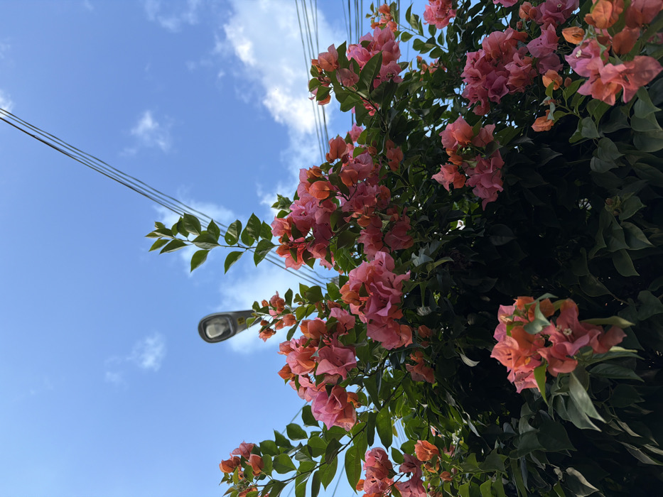 A low-angle shot reveals pink and orange bougainvillea flowers cascading down with green leaves against a blue sky with scattered clouds. Above and to the left, electrical wires stretch across the frame. A streetlight is visible amidst the flowers and leaves. The perspective is upward, creating a sense of looking up at the vibrant floral display against the sky.