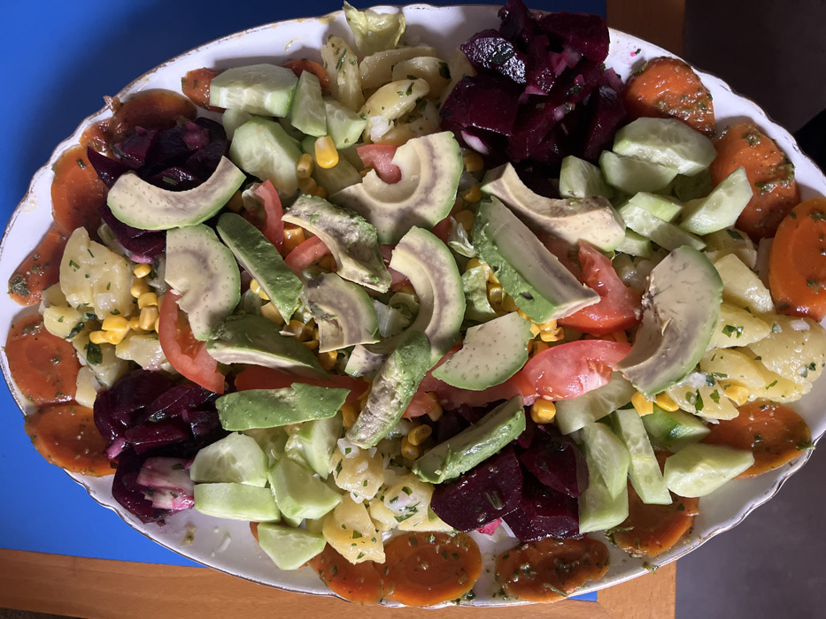 - "The scene, located in Le Puy-en-Velay, France, presents an overhead view of a large, oval-shaped serving platter filled with a mixed salad" by FM-UzABM2, licensed under CC BY 4.0