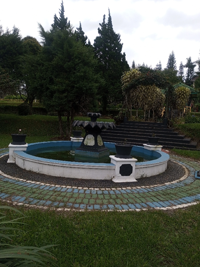 - "A park scene shows a circular fountain in the foreground, filled with stagnant water and topped with a black, tiered structure" by FM-udL9f1, licensed under CC BY 4.0