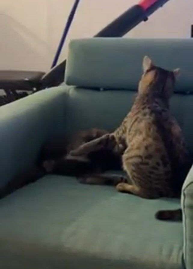 Two cats are interacting on a turquoise sofa. One cat, a tabby, is sitting upright and looking away while the other cat, which appears to be mostly black, is lying on its back and batting its paws at the tabby cat. The sofa is situated in an indoor environment, and a vacuum cleaner leans against the back of the sofa.