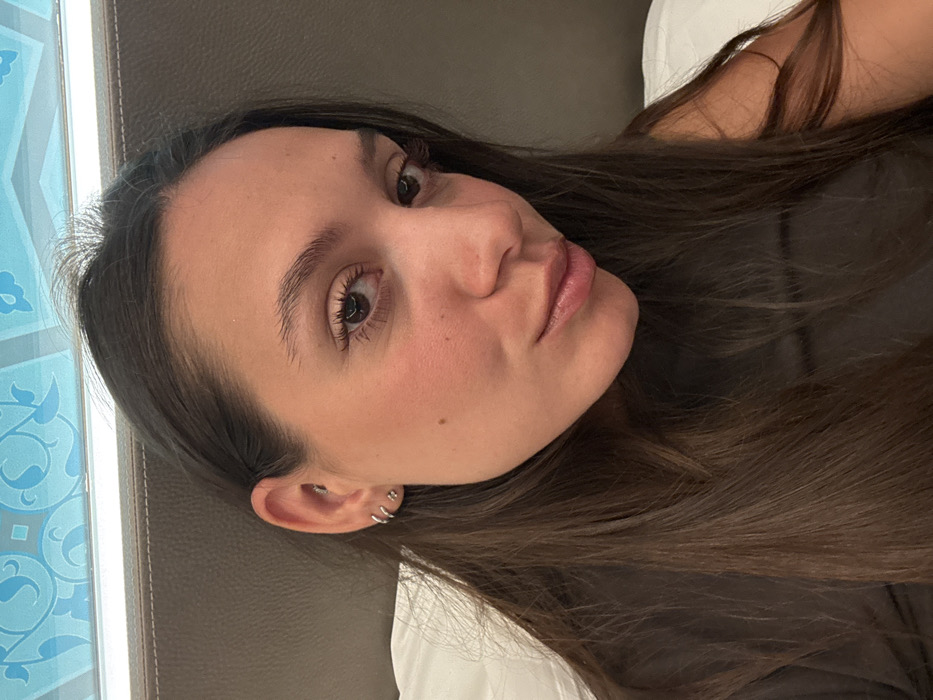 A woman with long, dark brown hair is reclining against a dark headboard and a white pillow. Her face, angled towards the camera, features smooth skin, light pink lips, brown eyes, and delicate eyelashes. She has multiple piercings in her ear. The background includes a window with a patterned design on the left. The overall impression is relaxed and natural.