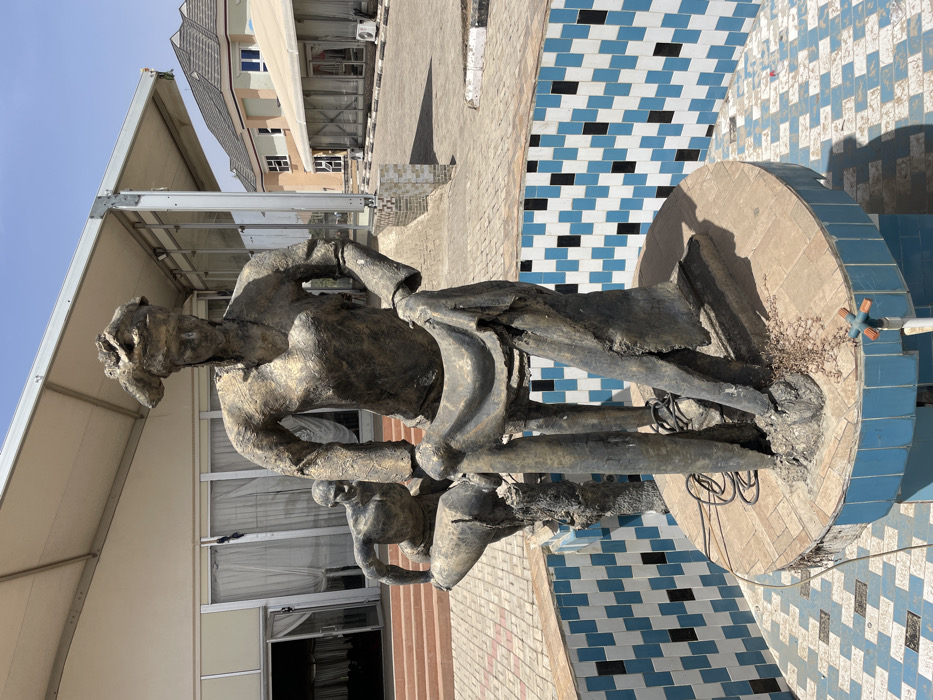 The image displays a bronze-toned, abstract-realist sculpture group centrally positioned within a dry, circular fountain structure, located in the city of New Stadium, Nigeria