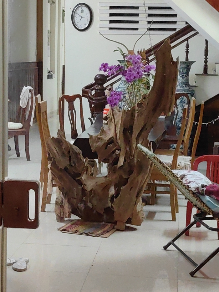 The image depicts the interior of a residence in Quảng Ngãi, Vietnam. The central focus is a large, irregularly shaped wooden sculpture, likely a root system, serving as a decorative centerpiece or table base. This sculpture is adorned with multiple clusters of vibrant purple orchids in bloom. Surrounding the central wooden structure are several wooden chairs, with parts of a table obscured behind it. In the mid-ground, a wooden staircase with a carved railing and balusters ascends towards the right. Two large, ornate blue-and-white patterned ceramic vases are positioned on a landing or shelf alongside the staircase. A black-framed wall clock displaying approximately 1:16 is mounted on the light-colored wall above white horizontal ventilation slats. To the far right, a red plastic chair is visible, along with a foldable reclining chair featuring a patterned cushion and metal frame. In the left foreground, a brown wooden doorframe or pillar partially obscures the view. On the light-colored tiled floor, a pair of white flip-flops is present near the foreground doorframe. A small, multicolored woven mat is placed on the floor directly beneath the wooden sculpture. A white cloth is draped over a wooden chair visible in the background hallway. No individuals are present in the scene.