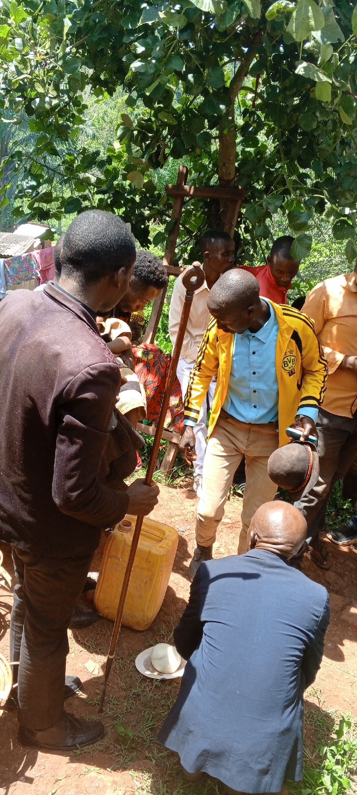A group of people, mostly men, are gathered outdoors under a tree. One man in a brown suit holds a cane and a yellow plastic container. A man in a yellow jacket with a blue shirt looks down at the container. Another man in a blue suit is squatting near a hat. Other individuals are standing around, observing. The setting appears to be rural, with trees and foliage visible in the background.