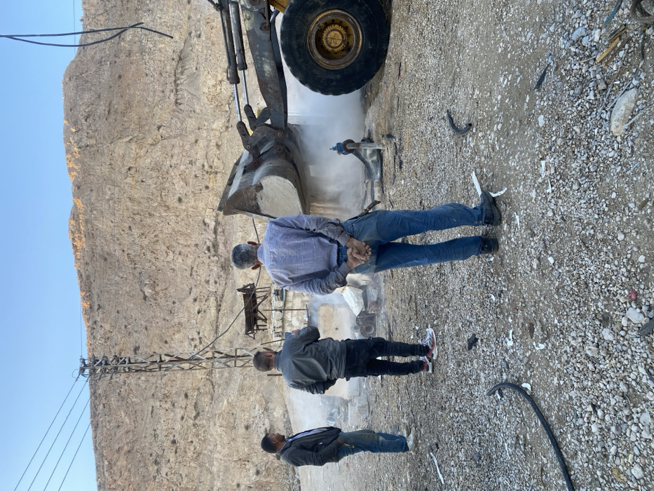 The scene, set in Dahiyat Harasta, Syria, shows an open-air industrial or quarry site at the base of a large, arid, rocky mountain. The ground consists of light-colored gravel mixed with scattered debris, including black hose pieces and white plastic fragments. In the foreground, three adult males stand with their backs to the camera, observing an ongoing operation. From left to right: The first male wears a dark jacket, blue jeans, and light shoes, with his hands in his pockets. The second male wears a dark gray jacket, dark pants, and multi-colored sneakers, holding a smartphone in his right hand, seemingly recording. The third male, positioned closest to the camera, wears a light blue button-up shirt, blue jeans, and dark shoes, with his hands clasped behind his back. To the right, a yellow front-end loader is partially visible, with its large metallic bucket lowered and containing light-colored material. A significant plume of white vapor or smoke emanates from beneath the bucket, partially obscuring a blue-handled valve attached to a pipe structure on the ground. In the mid-ground, a metal lattice electricity pylon supports overhead power lines. Further back, a dilapidated wooden or metal structure sits on a raised concrete platform. The background is dominated by the steep, light brown, fractured rock face of a mountain under a clear blue sky.