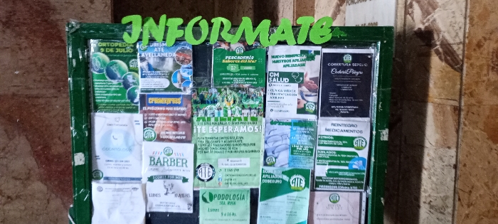 A green-framed bulletin board displays a variety of flyers and advertisements. "INFORMATE" is spelled out in green letters across the top. Flyers promote an orthopedic clinic, tourism, a seafood restaurant, CM Health services, funeral coverage, barber services, podology, and medication reimbursement. Many flyers bear the "ATE" logo, possibly an organization or company. The text "AFILIATE, TE ESPERAMOS!" is prominent on one flyer, suggesting recruitment.