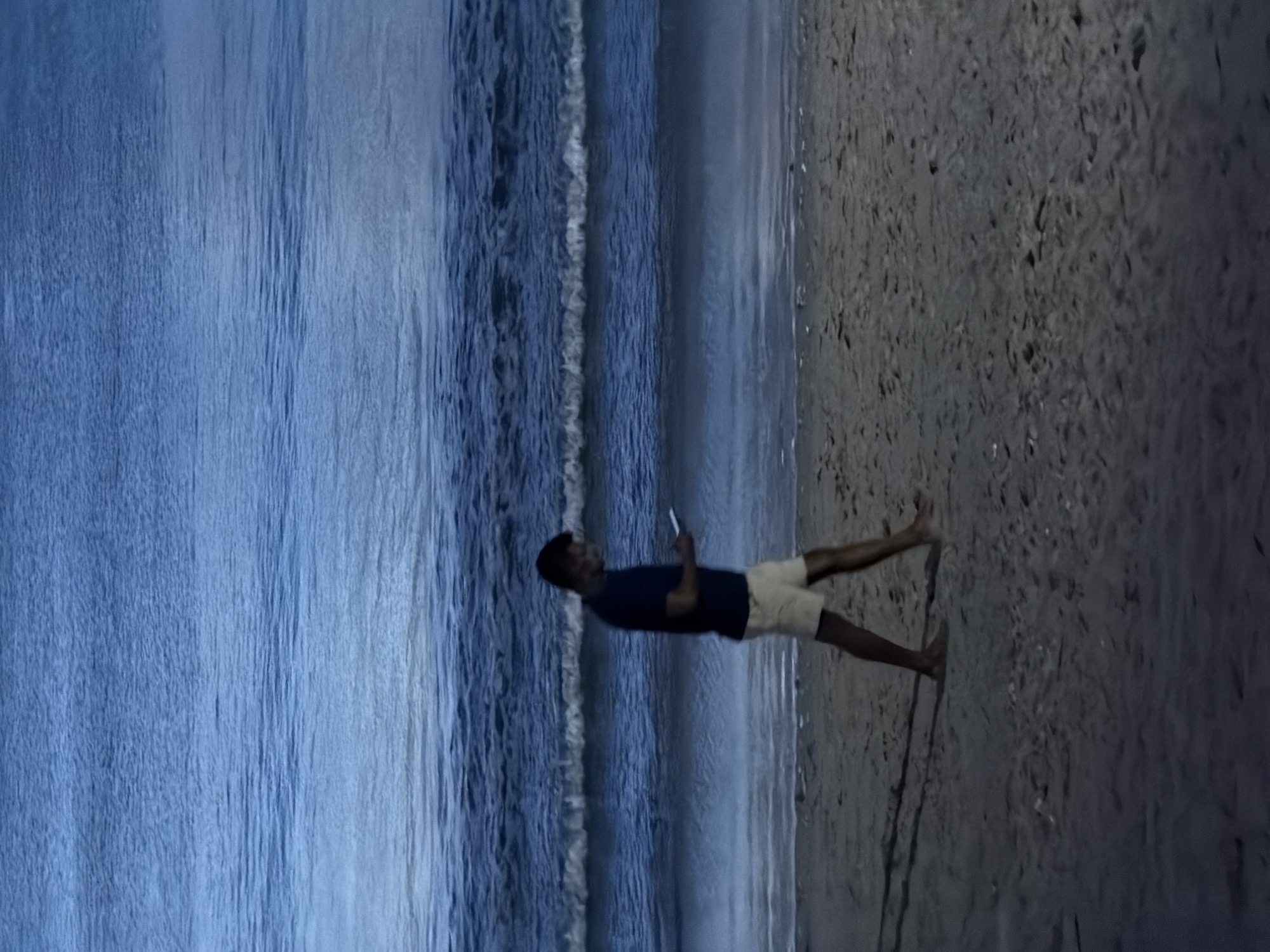A person is standing on the sand at the edge of the beach in Jimbaran, Indonesia, holding a cell phone