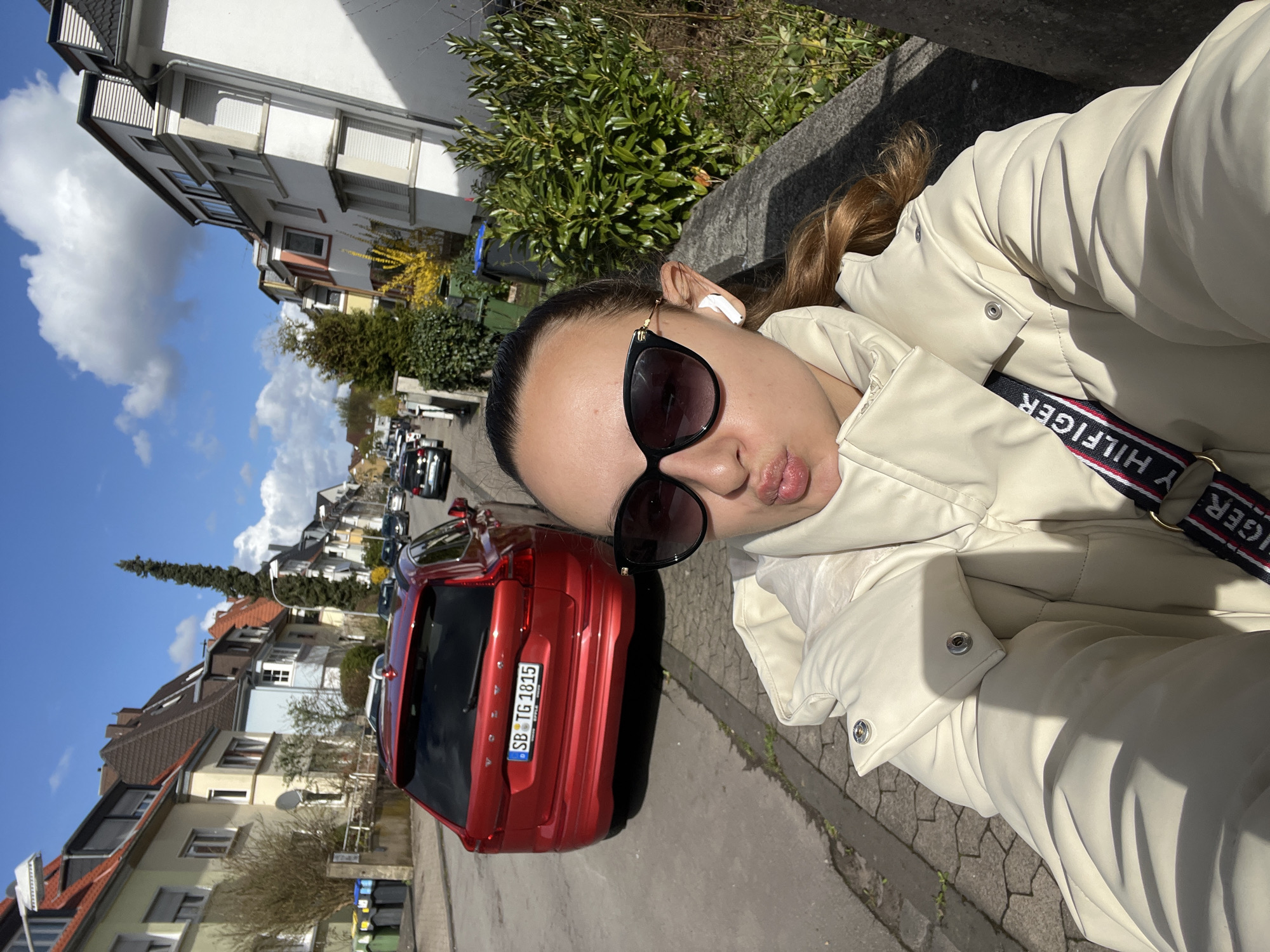 A female individual is captured in a selfie on a residential street in Saarbrücken, Germany. She is visible from the chest up, wearing a cream-colored puffer jacket, black sunglasses with gold accents, and white wireless earbuds in both ears. Her brown hair is pulled back, and her lips are pursed in a "duck face" expression. A strap from a "TOMMY HILFIGER" bag is visible over her right shoulder. Behind her, a red Volvo XC60 SUV with German license plate "SB TG 1815" is parked on the street. The license plate confirms the location as Saarbrücken. The street is lined with multi-story residential buildings featuring various pastel colors and red-tiled roofs, some with prominent dormers and external window shutters. Several other vehicles are parked further down the street. Sparse trees and shrubs, including one with yellow blossoms and a tall, slender conifer, are visible along the properties. The sky is bright blue with scattered white cumulus clouds, indicating a sunny day. Shadows suggest direct overhead sunlight. A concrete sidewalk or curb separates the individual from the street.