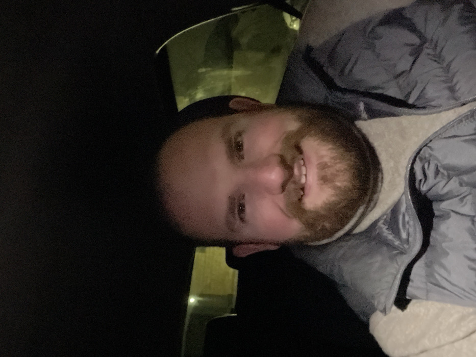 A person with a reddish beard and fair skin smiles slightly. They are wearing a light gray puffer jacket with a cream-colored lining. The background is dark on the left, transitioning to a blurry green and yellow light source on the right. Part of a vehicle interior is visible. The photo appears to have been taken at night or in low light.