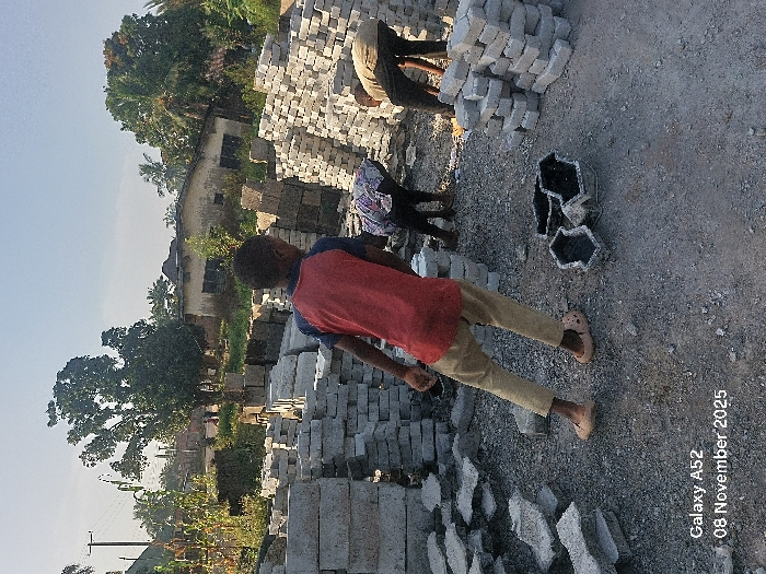 Outdoors, people work near piles of gray rectangular blocks, possibly bricks or concrete blocks