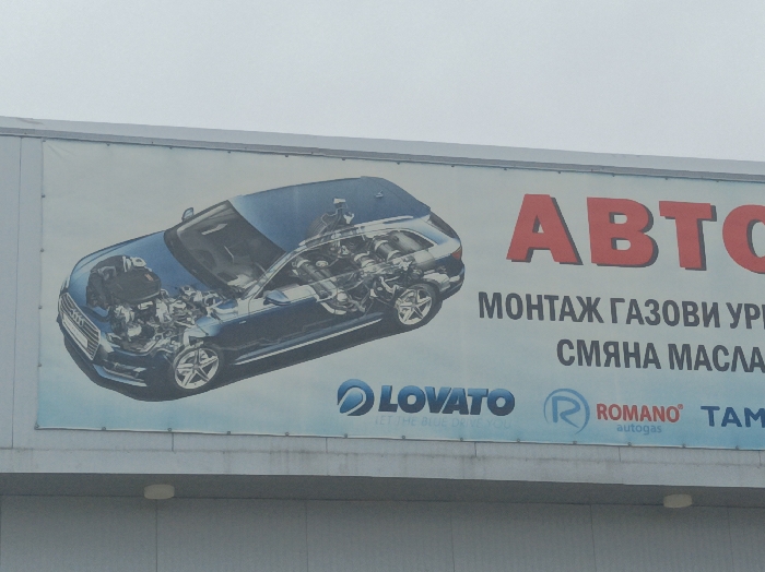 The image displays a large commercial billboard or banner mounted on the upper facade of a building under an overcast sky in Cherven Bryag, Bulgaria. The specific street address or precise building location within Cherven Bryag is not identifiable from the image content. The billboard features a graphic of a dark blue Audi SUV, depicted with a detailed cutaway view. The cutaway illustrates the engine components in the front section and the internal cabin, including what appears to be an LPG tank installation in the rear cargo area. The vehicle is angled, pointing slightly upwards and to the right. To the right of the car graphic, prominent red Cyrillic text reads "АВТО" (AUTO). Below this, additional black Cyrillic text states "МОНТАЖ ГАЗОВИ УРЕДБИ" (INSTALLATION OF GAS EQUIPMENT) and "СМЯНА МАСЛА" (OIL CHANGE). A third line of black text is partially visible below the oil change service description on the far right. Below the graphic and service text, three automotive-related brand logos are displayed. From left to right, these are the "LOVATO" logo in blue with the tagline "LET THE BLUE DRIVE YOU," the "ROMANO autogas" logo with an 'R' insignia, and a partially visible "TAM" logo. The billboard itself has a white background with a light blue gradient on the left side, appearing to be a flexible banner secured by visible fasteners along its top and bottom edges. Below the billboard, a segment of the building's light-colored, possibly off-white, facade is visible, exhibiting faint vertical streaking consistent with weathering. A circular, flush-mounted light fixture is present on this lower facade, situated to the left of the center. The sky above is uniformly light grey, indicating overcast conditions.