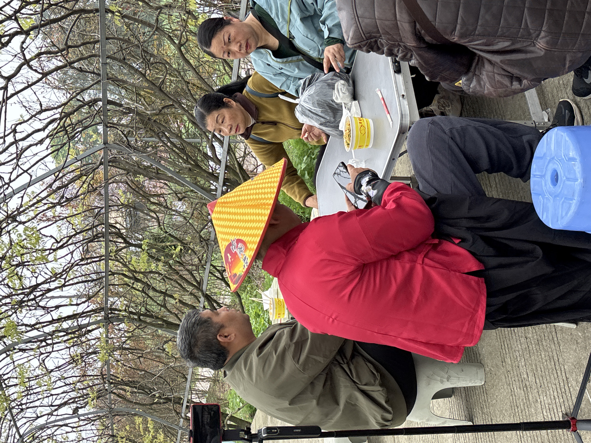 four individuals gathered outdoors. A man wearing a red jacket and a yellow conical hat is seated and looking at another man wearing an olive jacket. This second man sits in front of a mobile phone on a tripod, suggesting he may be recording or live-streaming. Two women are looking at the man wearing a yellow hat. They are on the other side of a small table covered with items including a package in a black plastic bag, a cup of instant noodles, and a red plastic utensil. A blue water bottle is on the ground. A brown coat is draped on a person sitting next to the table. The scene is framed by tree branches and metal supports, possibly indicating an outdoor trellis or arbor. The setting is Xianfeng, China.