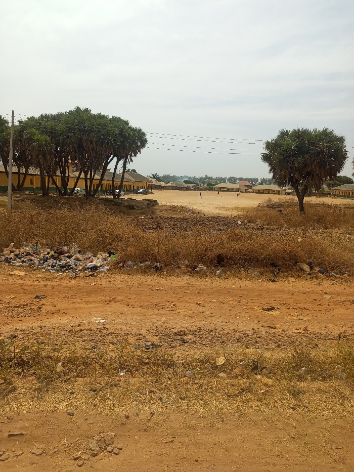 This image depicts an outdoor scene in Sabon Tasha, Nigeria, under an overcast sky. The foreground consists of reddish-brown earth with scattered patches of dry, light-brown vegetation. On the left side of the foreground, a substantial pile of refuse, including plastic bags and various debris, is accumulated. The midground features a wide, open expanse of reddish-brown dirt field. Within this field, approximately five to seven human figures are visible, engaging in activity. To the left, a cluster of tall, slender trees with dense green foliage partially obscures a row of single-story buildings characterized by yellow walls and dark roofs. Several vehicles are parked near these buildings. A single similar tree stands independently on the right side of the field. Multiple parallel power lines traverse the upper midground. The background reveals additional low-rise buildings along the distant horizon.