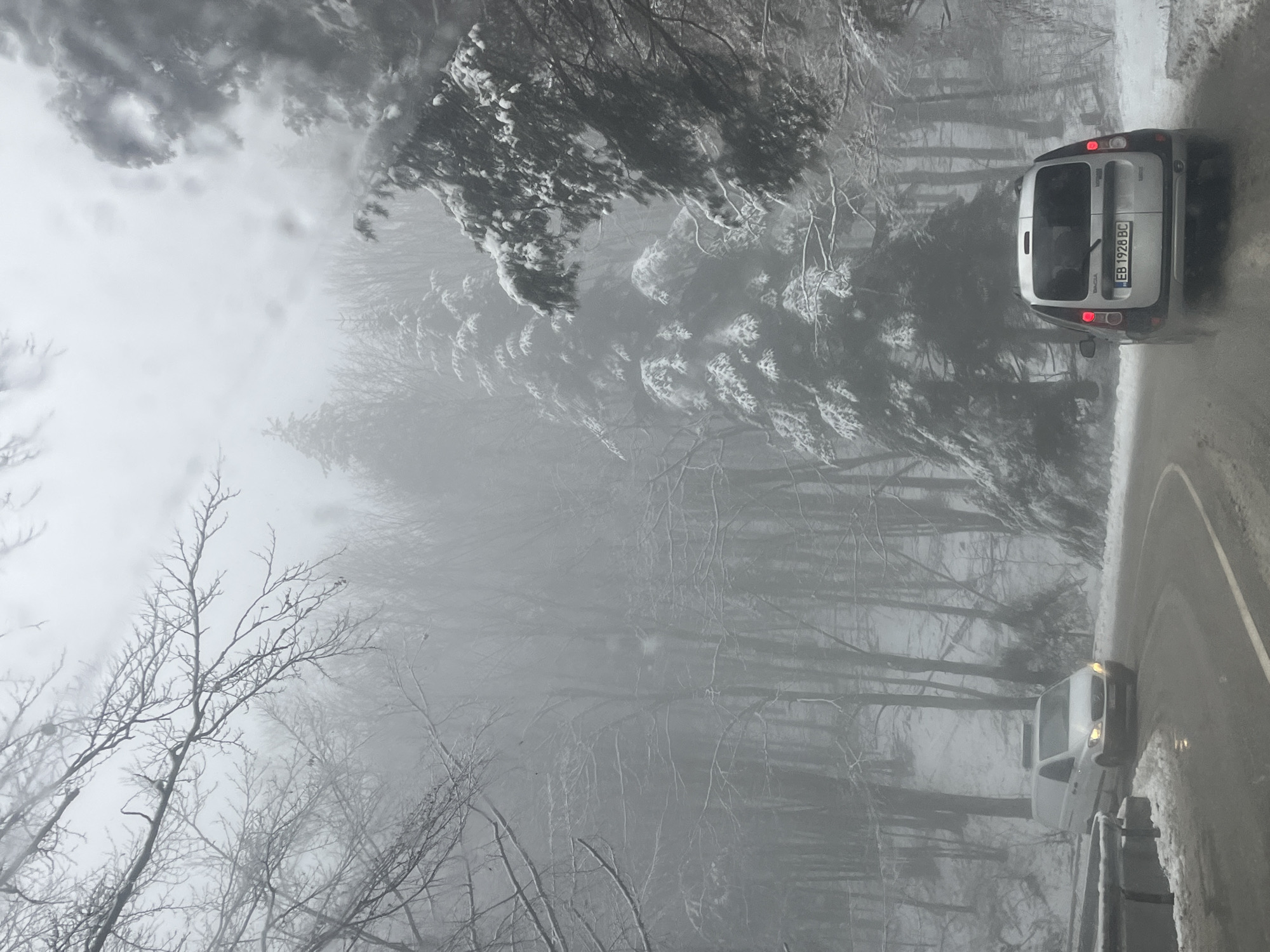 A photograph, possibly taken from inside a vehicle, shows a winding road in a snowy, foggy landscape