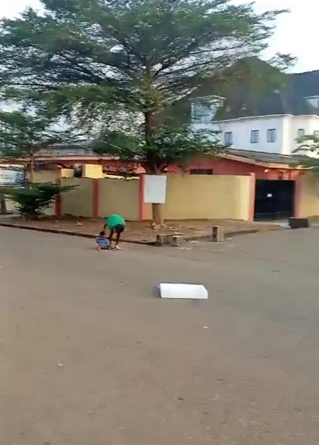 The video begins with a shot of a person in a green shirt next to a child bending down, likely interacting with them. They are on a street corner in front of a red and yellow building. There are trees near the buildings. The camera pans across the street and up the road, showing houses and a hill in the distance. There is a man walking in the road towards the hill. Cars are parked along the road. The camera zooms in to show a large white house in the background.