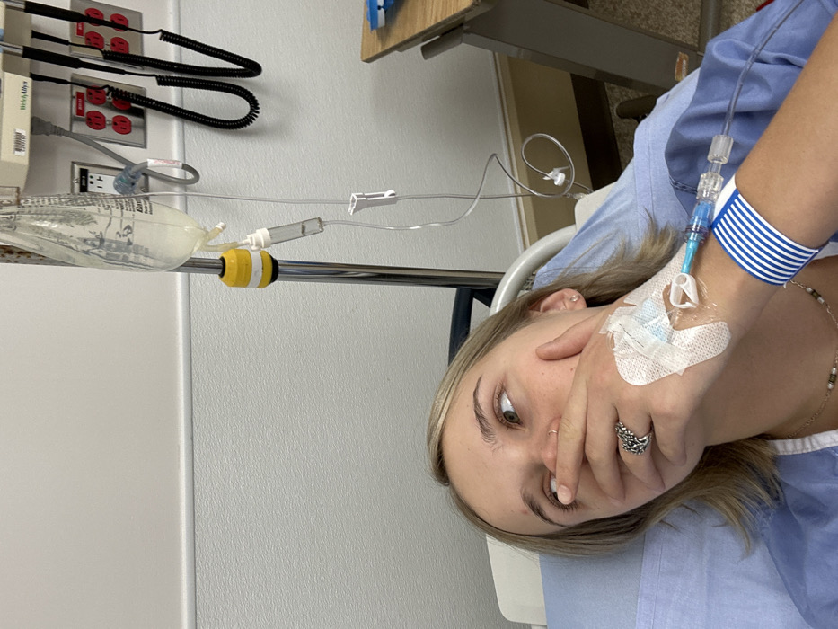 The image depicts a young blonde female patient lying in a hospital bed, wearing a blue gown or sheet
