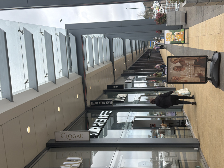 The image depicts an outdoor retail precinct in Bretton, United Kingdom, under an overcast sky. A modern building features a continuous facade of large glass storefronts and automatic sliding doors, covered by an extended overhead canopy. This canopy comprises transparent glass panels set within a grey metal framework, incorporating horizontal louver-like elements and recessed ceiling lights. Prominent store signage includes 'Clogau' (also seen on a vertical banner sign), 'BLACK SHEEP COFFEE,' 'LUSH,' 'RIVER ISLAND,' and 'NEXT.' The paved walkway consists of tan and light brown tiles. A woman, wearing a dark jacket and dark trousers, walks away from the camera along this pavement, carrying a light-colored shopping bag in her left hand. A person is partially visible inside the 'BLACK SHEEP COFFEE' store through its glass doors. Further along the walkway, several other individuals are observed walking or standing. Two A-frame signs are positioned on the pavement: one for 'Clogau,' displaying three women and the text "BONDS THAT LAST FOREVER," and another, located further from the camera, advertising 'Banana Arcade' with illustrations of various beverages. Concrete planters containing red-leafed shrubs are placed periodically. Beyond the retail establishments, a parking lot with numerous parked vehicles and lampposts is visible. A solitary bird is in flight in the upper right portion of the sky.