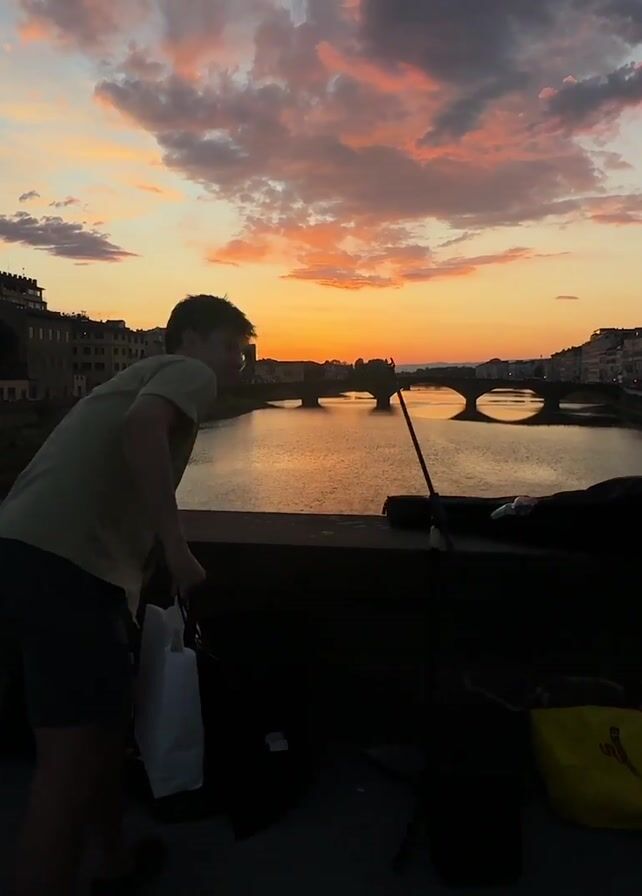 group of people on a bridge at sunset in Florence, Italy. A musician with curly hair plays a bass guitar. There's a Cube amplifier nearby. A couple sits on the bridge wall, looking out at the Ponte Vecchio bridge in the distance. Other people are standing around watching the musician or taking in the view. The sky is filled with pink and orange clouds. The buildings lining the riverbanks are visible in silhouette. A person walks past the camera, carrying a white shopping bag.