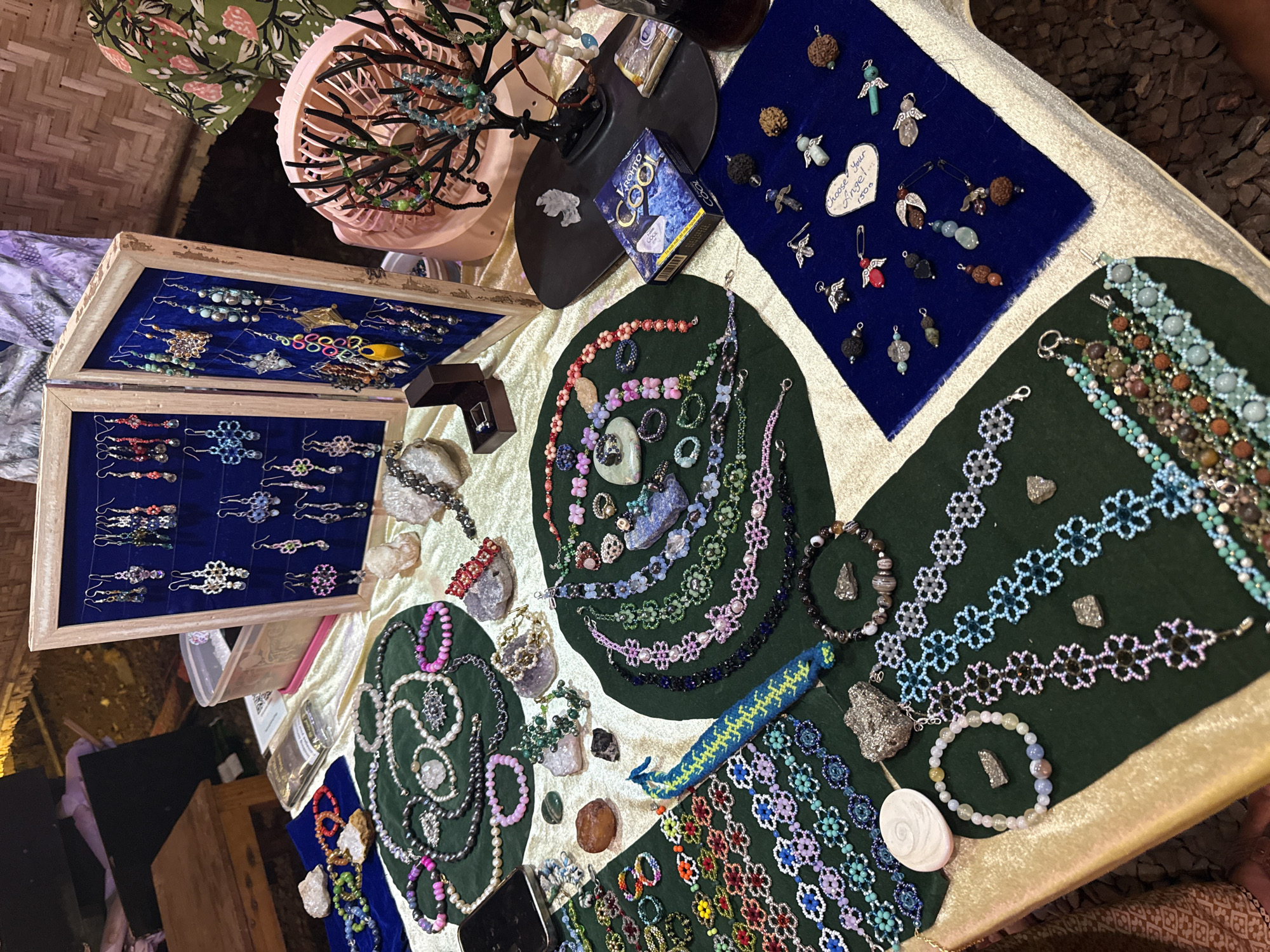 Captured from a high-angle perspective, the image presents a market stall laden with jewelry and artisanal crafts, seemingly located in Unknown, Unknown
