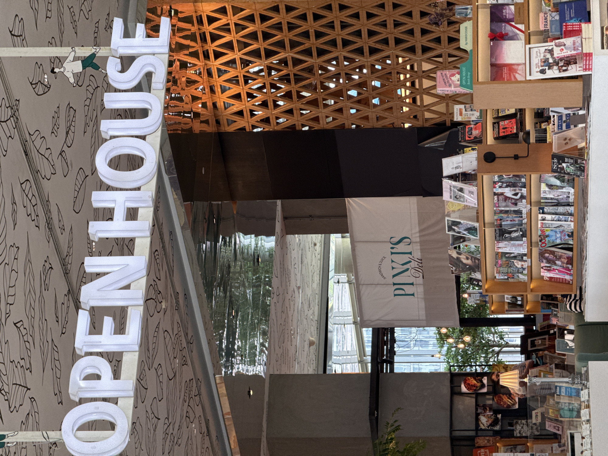 The image depicts the interior of a building in Bangkok, Thailand. A sign prominently displays "OPEN HOUSE". Another sign reads "PINKI'S Deli". Books and magazines are on display, suggesting a retail or library space. Decorative elements include wooden lattice work and stylized drawings on the walls. There are additional retail items on shelving. The environment is a well-lit, contemporary commercial space.