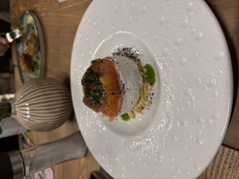 A white plate displays an artistic dish, featuring a cylindrical mound of dill-flecked cream cheese. This is topped with smoked salmon adorned with green relish. The base is sprinkled with a crumbly mixture, accented with black peppercorns. Small green drops of sauce are dotted around the dish. In the background, there's another plate with food and a decorative vase, along with a pepper grinder.
