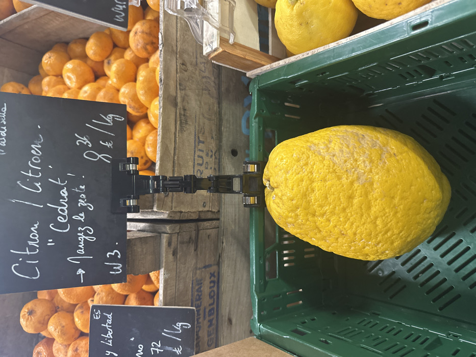 An indoor market stall in Brussels, Belgium, presents a display of fresh produce. In the immediate foreground, a single large, yellow, heavily textured citron (cedrat) fruit, elongated and irregular in shape, rests within a green plastic ventilated crate. A black chalkboard sign, suspended by a black articulated plastic arm clipped to the green crate, identifies the fruit as "Citron / Citroen" and specifically "Cedrat," with an instruction to "Mangez le zeste!" (Eat the zest!), priced at 8€/kg. To the left, a partial black chalkboard sign displays text in Spanish, including "y libertad," with a price in Euros per kilogram. In the background, numerous smaller, round, bright orange citrus fruits, consistent with mandarins or tangerines, are piled in rustic wooden crates. One visible wooden crate bears the partial blue inscription "POMMERAIE" and "GEMBLOUX," indicating a Belgian origin or connection. The scene is illuminated by ambient indoor lighting.