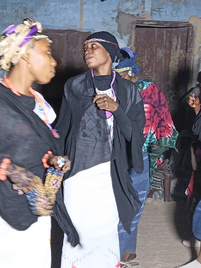 Two women, likely attending a cultural event, stand prominently. One wears a vibrant purple and cream head wrap, a black shawl, coral-colored beads, and carries a small, beaded purse. The second woman has a black head covering with a beaded band, a black shawl over a lighter top, a white skirt with red stitching at the hem, and a purple necklace. Other people are visible in the background, some wearing colorful patterned clothing. The setting appears to be indoors, possibly in a building with painted walls and a closed wooden door.