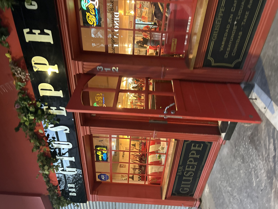 A sideways view of "Bar Giuseppe," a red-painted building with large windows displaying "café" and "bar" signs. The address, 312, is visible above the door. Inside, patrons sit at tables. A black sign with gold lettering reads "Bar Giuseppe" and offers "Variedad en Café, Desayunos" and "Comidas-Take Away." Greenery adorns the building's exterior. Neon signs are visible through the window.