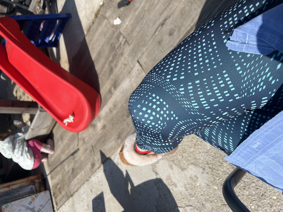 An overhead, first-person perspective photograph captures an outdoor scene in Dospey, Bulgaria, on a sunny day. In the foreground, the legs of an individual are visible, clad in dark teal leggings featuring a light blue, pixelated square pattern. The right foot wears a brown, fur-lined slipper with red trim, while the left foot is obscured. A light blue fabric, likely from a shirt or shorts, covers the lap, and a portion of a black chair armrest is visible in the bottom left. The midground features a wooden plank surface, partially illuminated by direct sunlight, casting distinct shadows. To the left of the planks, a concrete area is visible. In the background, a young child is observed crouching near a raised wooden planter box containing sand or dirt. The child wears a light-colored hooded jacket with faint pink polka dots, pink pants, and light-colored boots, and appears to be interacting with the contents of the planter. Behind the planter, miscellaneous objects including a piece of metal sheeting and white debris are present. To the right of the child, a red plastic children's slide with a blue support frame is positioned on the wooden planks. A small, light-colored figurine or object rests on the slide's surface.