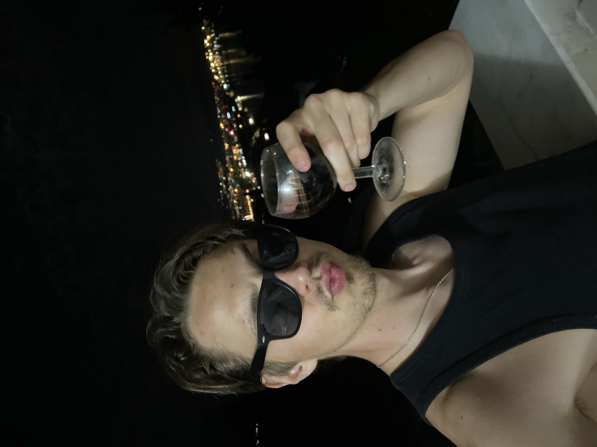 - "A man wearing a black tank top and sunglasses holds a glass of red wine in front of a dark background illuminated by city lights, potentially located in Šušanj, Montenegro" by FM-xOjSo2, licensed under CC BY 4.0