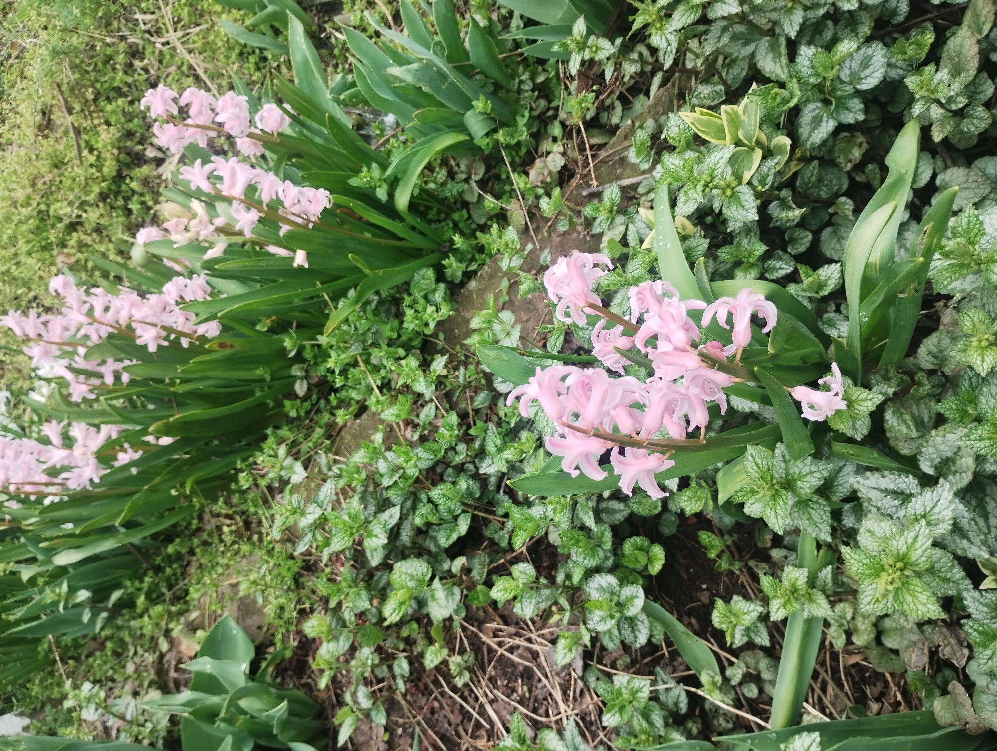 flower bed with pink hyacinths in bloom, growing alongside other foliage including what appears to be deadnettle