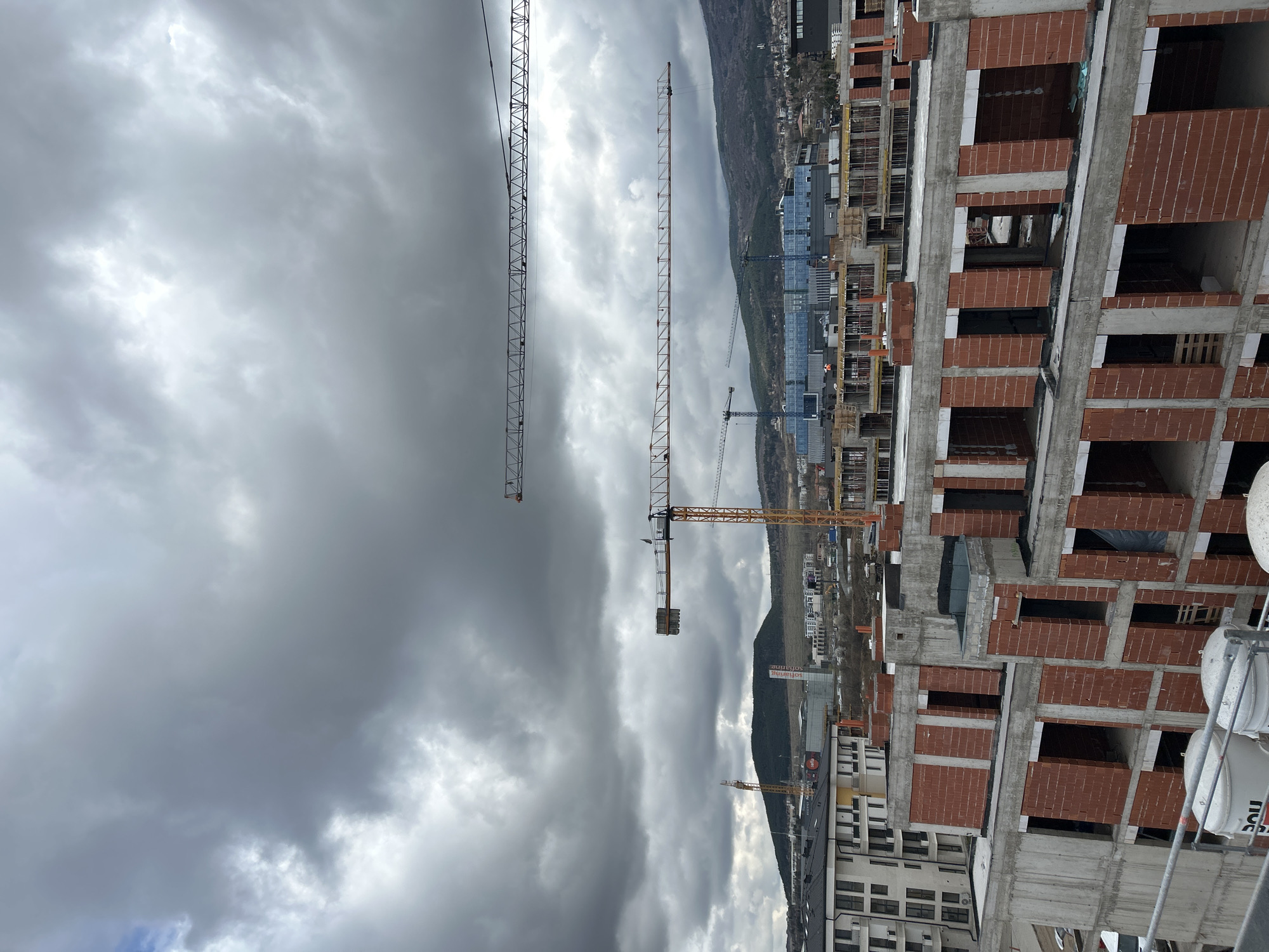 construction site in Sofia, Bulgaria. Several high-rise buildings are under construction, with bare brick walls and concrete supports visible. Cranes are positioned throughout the site, likely used for lifting materials. The sky is overcast with dark, heavy clouds. In the background, mountains can be seen in the distance. Other buildings are visible, including what appears to be a large retail or office complex.