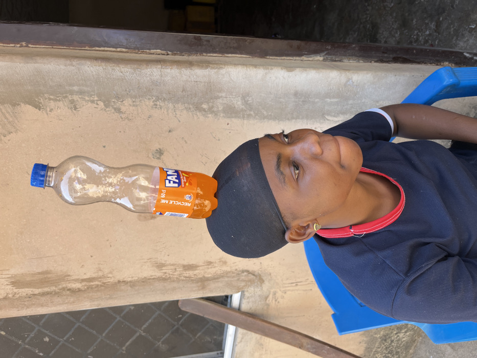 A young Black female, estimated to be in her late teens or early twenties, is depicted seated on a blue plastic monobloc chair in an unidentified outdoor or semi-outdoor setting in Jos, Nigeria. She wears a black head covering, a black short-sleeved top with a red and white ribbed collar, and a gold-colored stud earring is visible in her left ear. An empty, clear plastic Fanta orange-flavored drink bottle, 50 cl in size with a blue screw cap, is balanced upright on the crown of her head. The bottle’s orange and white label, visible at its base, includes the text "RECYCLE ME," and a small amount of orange liquid residue is present. The woman's head is turned slightly to her right, and her gaze is directed off-camera with a neutral expression. The background features a textured, light brown rendered wall. To the left, a partial window with a dark frame and security grating is visible, along with a wooden plank leaning against the wall. To the right, a darker vertical architectural element, possibly a door frame, leads into a shadowed area. The ground appears to be concrete or bare earth.