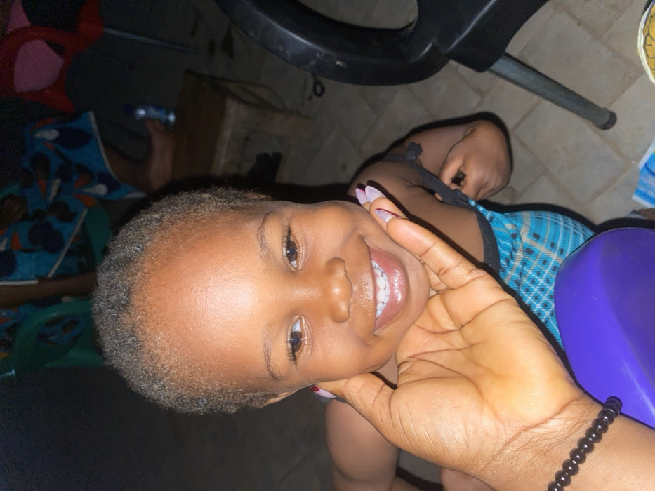 A young child lies on their side, a hand gently cradling their face. The child smiles brightly, revealing a set of white teeth. They wear a blue and white plaid top. The background features a mix of indoor and outdoor elements, with a glimpse of tiled flooring, furniture, and other individuals nearby. The overall lighting is soft, highlighting the child's skin tone and joyful expression.