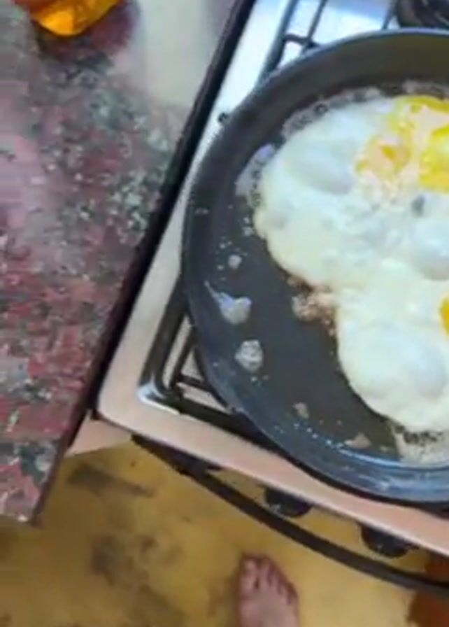 pair of eggs frying in a black skillet on a gas stove. The eggs are sunny-side up with runny yolks. A plate sits nearby with two pieces of toast and a portion of sliced avocado. A cube of butter is on a wrapper on the counter, along with various other items including a carton of liquid, and a pink beverage in a measuring cup. The video is filmed from a high angle, and the person filming is barefoot and wearing patterned pants.