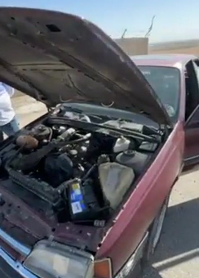 maroon sedan with its hood open, parked on the side of a desert road on a sunny day