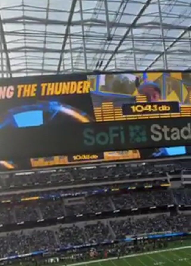 n American football stadium, likely SoFi Stadium, during a game. The stadium is crowded with fans, and a large screen displays the text "BRING THE THUNDER" along with decibel level readings that fluctuate. There are glimpses of people in the foreground. The video appears to be taken from a spectator's perspective.