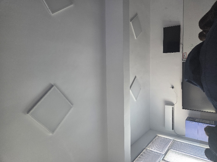 The image displays an indoor room in Panagyurishte, Bulgaria, from a perspective behind seated individuals. The room features white walls and ceiling. Four square LED panel lights are embedded in the ceiling, with one prominent in the foreground and three others visible further back. A large window with light-colored horizontal blinds occupies the left side of the room. A white split-system air conditioning unit is mounted on the wall above a partially visible light blue two-door cabinet on the left. The front wall holds a mounted black rectangular flat-screen monitor. Below and to the left of this monitor, a larger, dark rectangular surface, likely an interactive display or whiteboard, is partially visible. A small white label with red text is affixed to the wall between the monitor and the air conditioner. In the immediate foreground, the back of a person wearing a dark blue hooded garment is visible. To their right, the tops of the heads and dark hair of at least two other individuals are present, indicating multiple occupants are seated facing the front of the room.