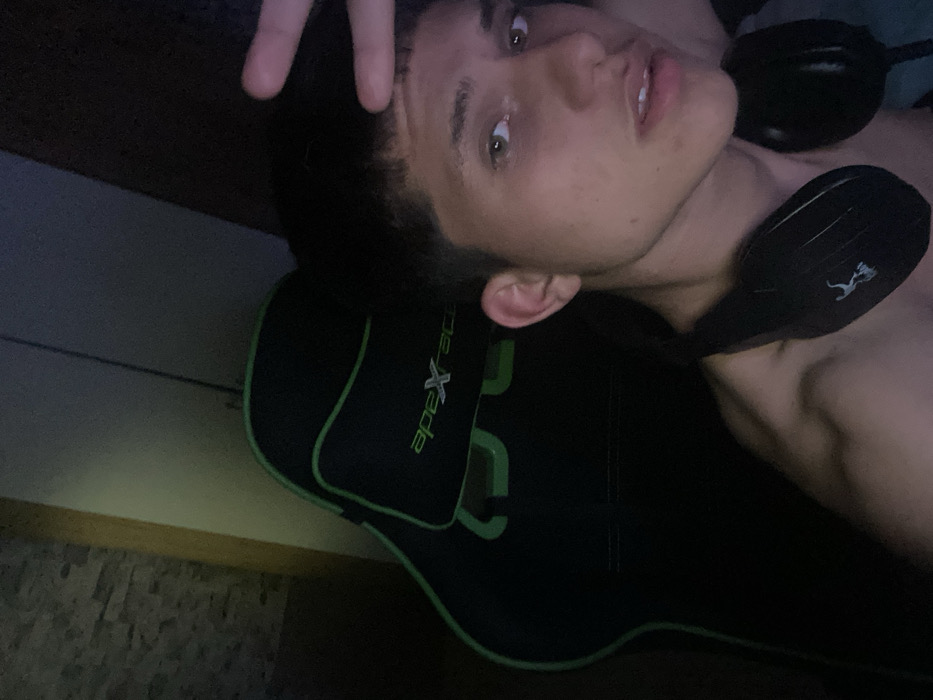 The scene depicts a young male in an indoor setting within Simeonovgrad, Bulgaria. The individual, who appears shirtless, possesses dark hair styled with a short fringe and light-colored eyes, and faces the camera directly. He wears black over-ear headphones with a white animal logo around his neck. His right hand is raised to head level, forming a "V" gesture with his extended index and middle fingers. He is seated in a black gaming chair accented with green trim, featuring the "apex ace" brand logo on the headrest. The background is dimly lit, revealing a textured, possibly stone-patterned wall section and a vertical wooden beam on the left, and a partially visible light-colored panel or door on the right.