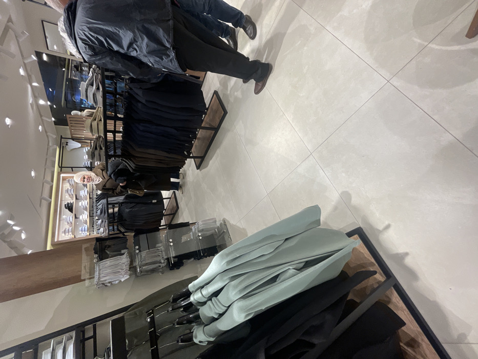 A clothing store interior features clothing racks with various apparel. At the top, men's jackets in blue and black hang densely. Further down, neatly stacked and folded shirts and sweaters are visible. A woman with a headscarf is browsing. In the foreground, a rack displays light green and black folded items. The tiled floor is clean and well-lit, contributing to the store's organized atmosphere.