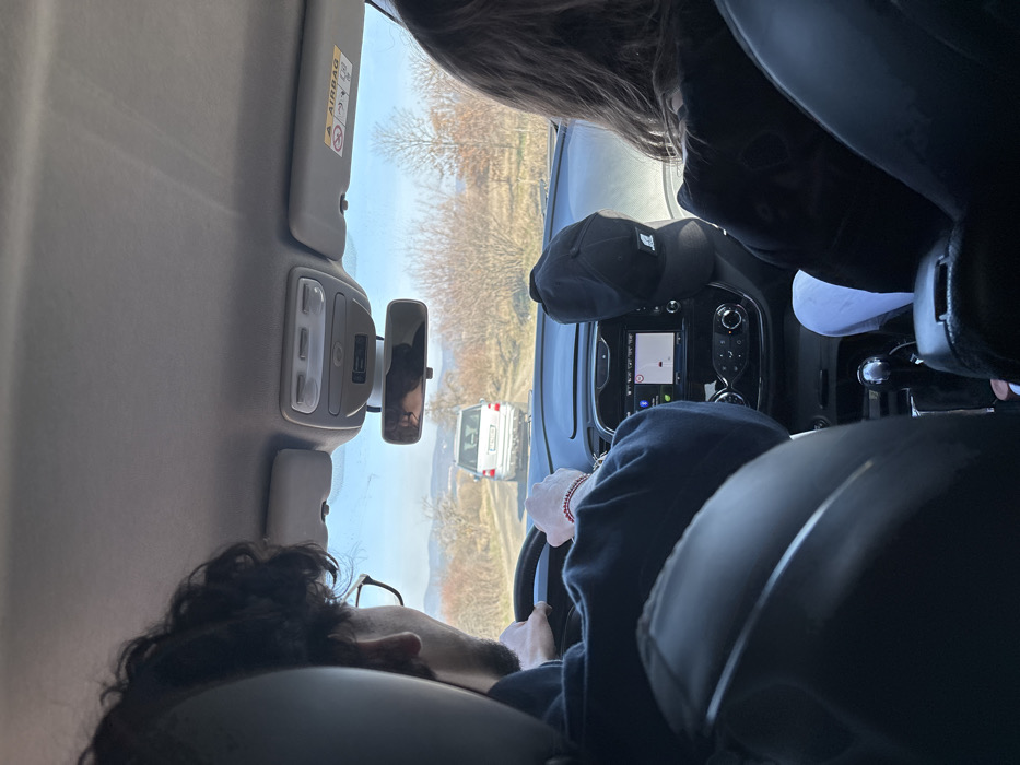 The image presents an interior view from the backseat of a moving vehicle, looking forward through the windshield