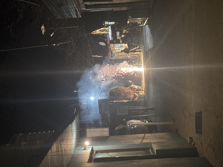 This image captures a nighttime scene on a narrow, paved street in Kasar Devi, India, marked by active pyrotechnic discharge