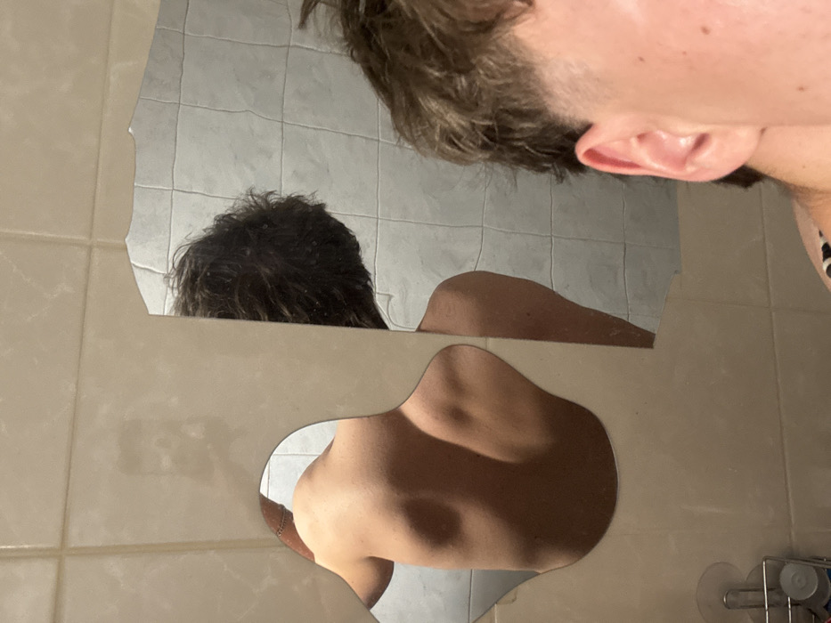 The image displays a young male individual taking a photograph of himself in a broken mirror within an indoor setting, likely a bathroom. The mirror, fragmented into several irregular pieces, is affixed to a wall covered with light beige rectangular tiles. In the larger, left-hand fragment of the mirror, the individual's bare upper back is visible, showcasing prominent shoulder blades and musculature, suggesting he is facing away from the camera. His right shoulder and a portion of his upper arm are also reflected. In the foreground, on the right side of the image, the right side of the individual's head, including his ear and part of his jawline, is visible; his hair is short, dark, and appears to have a textured or styled cut with shorter sides. The mirror's reflection also shows a background of light blue or grey square tiles, possibly from an adjacent wall or floor. A clear plastic suction-cup caddy, containing small white bottles, is attached to the beige tiled wall in the lower-left quadrant. The specific location in the city of Troyan, Bulgaria, cannot be determined from the provided image.