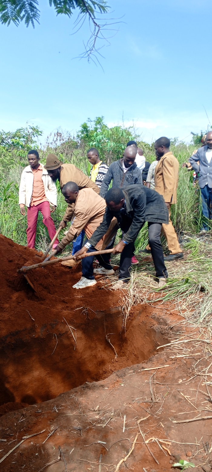 The image depicts an outdoor scene in the city of Namisha, Democratic Republic of the Congo, under a clear blue sky. Approximately ten to twelve adult males are gathered around an excavated rectangular pit in reddish-brown soil. In the immediate foreground, two men are actively digging or shaping the pit with long-handled hoes. The man on the left is dressed in a brown jacket over a blue garment, blue trousers, and white sneakers, while the man on the right wears a dark jacket, dark trousers, and light-colored shoes. A substantial mound of displaced reddish-brown earth lies adjacent to the excavation. Other men stand nearby, observing the activity; their attire varies, including a light jacket over an orange shirt with red pants, a brown jacket with a dark hat, a grey hooded jacket, and a light grey suit jacket. The surrounding environment consists of dense green vegetation and tall grasses, with scattered dry plant debris visible on the reddish-brown ground around the pit.