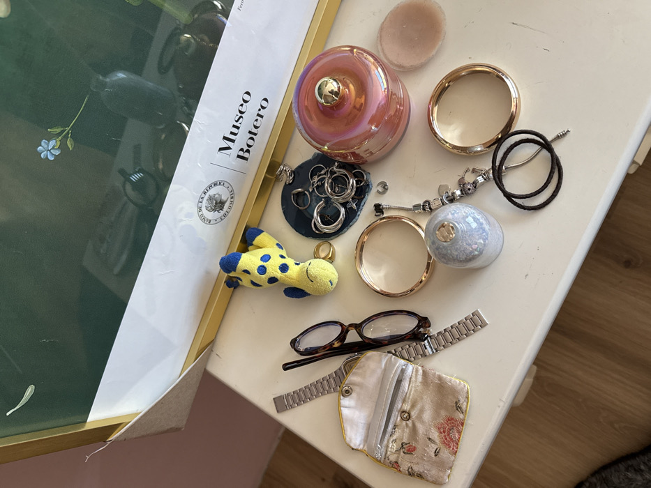 A framed print reading "Museo Botero," a plush giraffe toy, and an assortment of personal items are scattered on a white surface. The items include a pink jar, rings on a dark blue circular plate, round cosmetic containers, gold-rimmed circles, a charm bracelet, a black cord, glasses, a watch strap, and a small pouch with floral patterns. The objects are arranged haphazardly, suggesting a collection of possessions or personal effects.