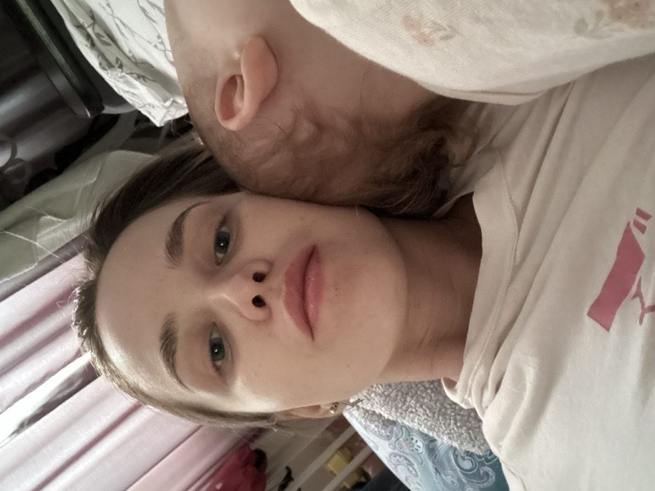 The image presents a close-up view of two individuals in an indoor, domestic environment, presumed to be in Chaikovsky, Russia; however, the precise location within the city is not discernible from the visual evidence. A woman, appearing to be an adult, occupies the left and central portion of the frame. She has light-colored hair, visible around her face, and light-colored eyes. Her gaze is directed towards the camera. She is wearing a light-colored, possibly white, t-shirt with a distinct pink graphic on the lower visible section. To her right, an infant's head is visible, resting against the woman. The infant's ear and a portion of its light-colored hair are clearly visible. The infant appears to be resting or sleeping, partially covered by a light-colored blanket or fabric with subtle patterns. The background includes glimpses of light-colored, possibly striped, curtains on the left and indistinct bedding or furnishings on the right. The overall lighting suggests an indoor setting, potentially during daytime or with artificial light.