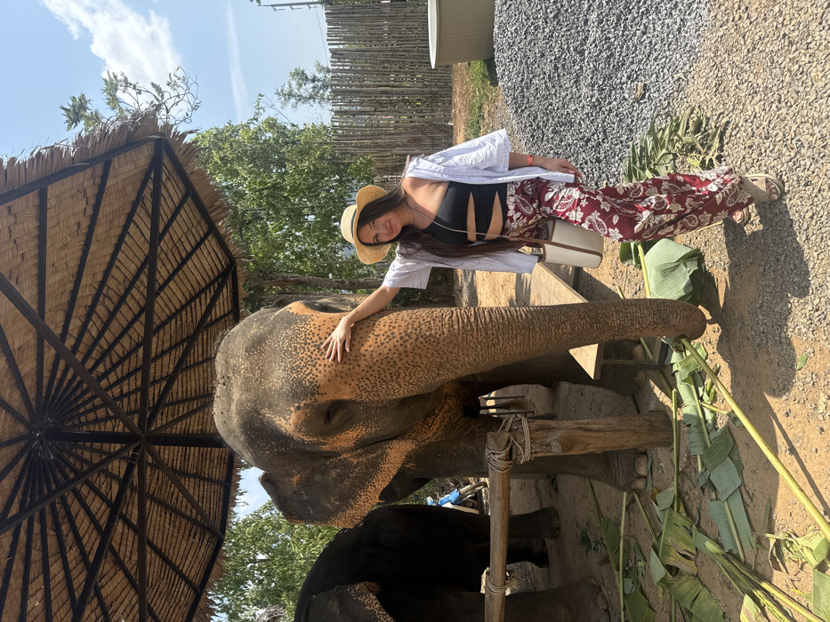 - "A woman in a hat, crop top, white shirt, and patterned pants stands next to an elephant" by FM-j2hvk2, licensed under CC BY 4.0