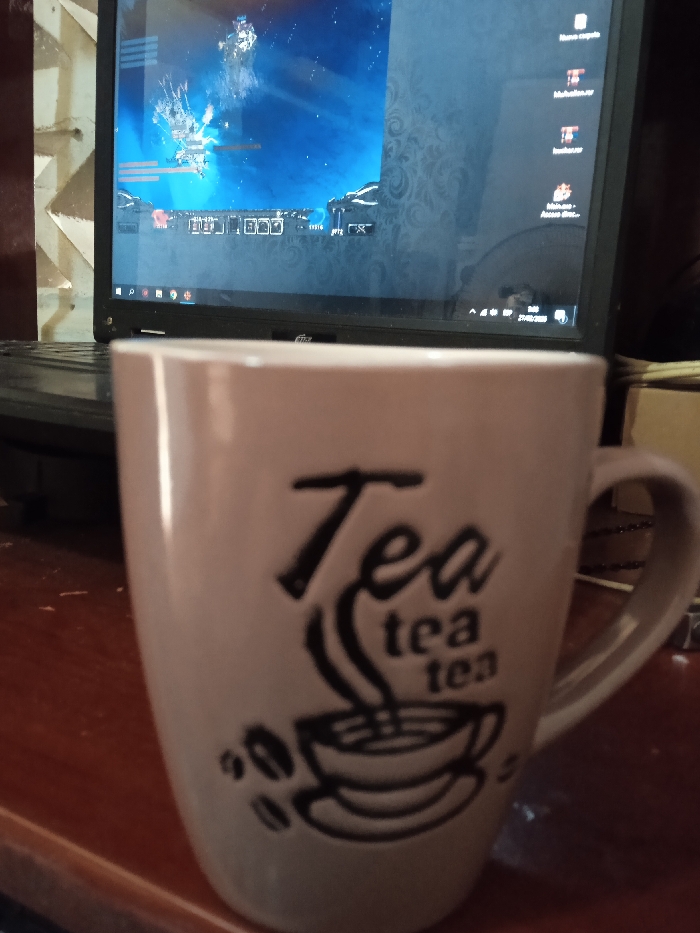 The image depicts an indoor scene in Macho Muerto, Venezuela. In the foreground, a light-colored ceramic mug with a prominent handle on the right rests on a dark reddish-brown polished wooden surface. The mug is adorned with black stylized text that reads "Tea," with "tea tea tea" in smaller font below it, accompanied by a graphic illustration of a steaming cup and several coffee beans. Behind the mug, a black Acer laptop is open, positioned on the same wooden surface. The laptop screen displays a split interface; the left section shows a video game, characterized by spacecraft engaged in what appears to be combat or exploration against a blue cosmic background with integrated heads-up display elements. The right section of the screen presents a Windows desktop environment, featuring several file icons, including "MachoMalou.rar," "backups.rar," and "Inicio.exe - Acceso direc...". The Windows taskbar is visible at the bottom of the screen, indicating the date "27/02/2020" and the time "9:40". The immediate background behind the laptop consists of a light-colored wall or partition with a subtle textured pattern on the left, transitioning to a darker, indistinct area on the right. No individuals are present in the frame.