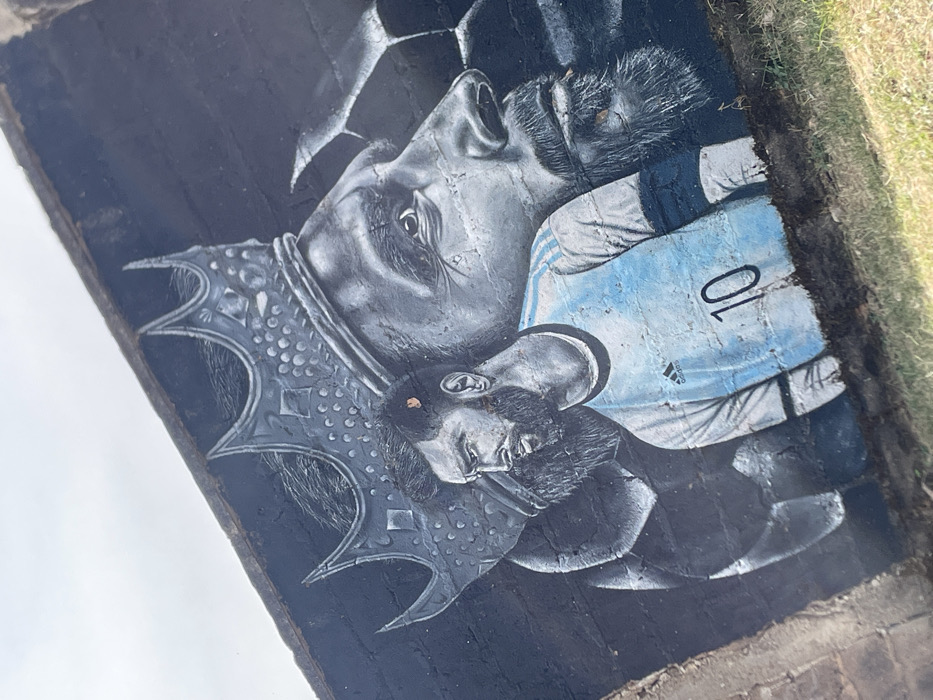 A mural is depicted on an exterior wall in Naraguta Hausawa, Nigeria. The artwork features two male figures: a prominent, younger man in the foreground and a larger, older man in the background. The foreground figure, identified as Lionel Messi by his light blue and white striped Argentina national football team jersey with the Adidas logo and number "10," is shown from the chest up, in profile, looking left. He has a beard and dark hair. The background figure, rendered in grayscale, is larger and positioned behind Messi, wearing a crown and also having a beard. This figure's face is turned towards the right, with a solemn expression. The mural is primarily grayscale, with Messi's jersey providing the only significant color. The wall itself appears to be constructed of dark, rough material, possibly brick or concrete, painted dark gray or black as a base. The top edge of the wall is visible against a light, overcast sky. The bottom edge of the wall meets a patch of green grass and dark soil, indicating an outdoor setting. The perspective is slightly angled, looking up at the mural.